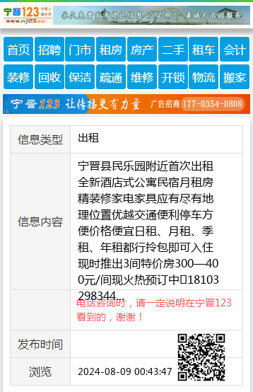宁晋县民乐园附近首次出租全新酒店式公寓民宿月租房精装修家电家具应有尽有地理位置优越交通便利停车方便价格便宜日租、月租、季租、年租都行拎包即可入住现时推出3间特价房300—400元/间现火热预订中18103298344 【电话咨询时,请一定说明在宁晋123看到的,谢谢!】 |