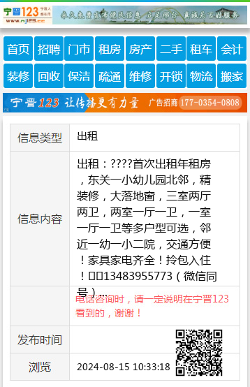 出租:????首次出租年租房,东关一小幼儿园北邻,精装修,大落地窗,三室两厅两卫,两室一厅一卫,一室一厅一卫等多户型可选,邻近一幼一小二院,交通方便!家具家电齐全!拎包入住!☎️13483955773(微信同号) 【电话咨询时,请一定说明在宁晋123看到的,谢谢!】 |