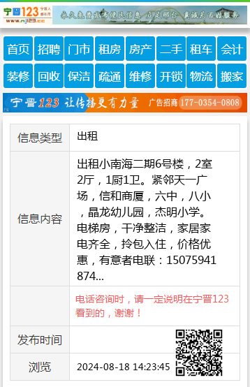 出租小南海二期6号楼,2室2厅,1厨1卫。紧邻天一广场,信和商厦,六中,八小,晶龙幼儿园,杰明小学。电梯房,干净整洁,家居家电齐全,拎包入住,价格优惠,有意者电联:15075941874 【电话咨询时,请一定说明在宁晋123看到的,谢谢!】 |