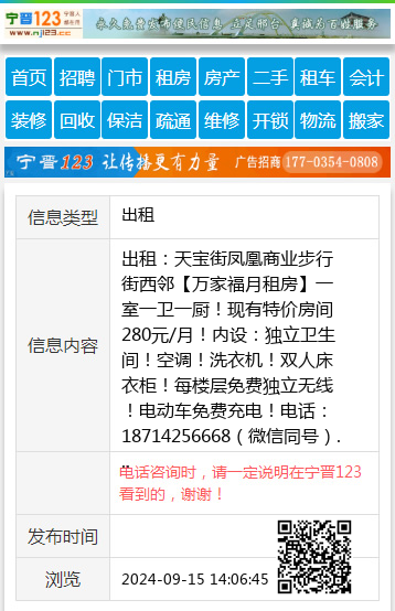 出租:天宝街凤凰商业步行街西邻【万家福月租房】一室一卫一厨!现有特价房间280元/月!内设:独立卫生间!空调!洗衣机!双人床衣柜!每楼层免费独立无线!电动车免费充电!电话:18714256668(微信同号) 【电话咨询时,请一定说明在宁晋123看到的,谢谢!】 |