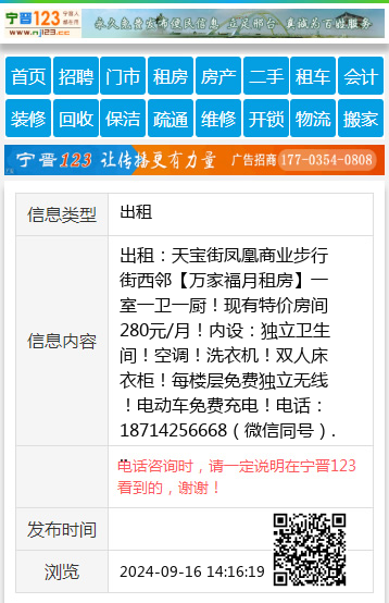 出租:天宝街凤凰商业步行街西邻【万家福月租房】一室一卫一厨!现有特价房间280元/月!内设:独立卫生间!空调!洗衣机!双人床衣柜!每楼层免费独立无线!电动车免费充电!电话:18714256668(微信同号) 【电话咨询时,请一定说明在宁晋123看到的,谢谢!】 |