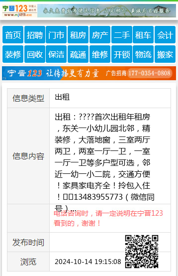 出租:????首次出租年租房,东关一小幼儿园北邻,精装修,大落地窗,三室两厅两卫,两室一厅一卫,一室一厅一卫等多户型可选,邻近一幼一小二院,交通方便!家具家电齐全!拎包入住!☎️13483955773(微信同号) 【电话咨询时,请一定说明在宁晋123看到的,谢谢!】 |