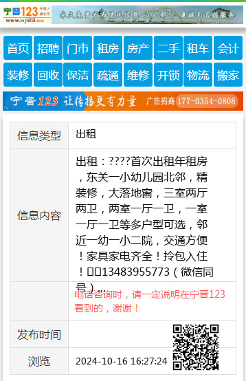 出租:????首次出租年租房,东关一小幼儿园北邻,精装修,大落地窗,三室两厅两卫,两室一厅一卫,一室一厅一卫等多户型可选,邻近一幼一小二院,交通方便!家具家电齐全!拎包入住!☎️13483955773(微信同号) 【电话咨询时,请一定说明在宁晋123看到的,谢谢!】 |