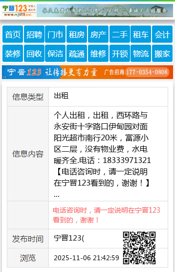 个人出租,出租,西环路与永安街十字路口伊甸园对面阳光超市南行20米,富源小区二层,没有物业费,水电暖齐全.电话:18333971321 【电话咨询时,请一定说明在宁晋123看到的,谢谢!】 |