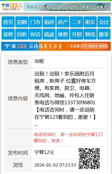 出租!出租!家乐园附近月租房,新房子 位置好停车方便。有家具、厨卫、电器、无线网、地暖、拎包入住联系电话与微信13373096801 【电话咨询时,请一定说明在宁晋123看到的,谢谢!】 |