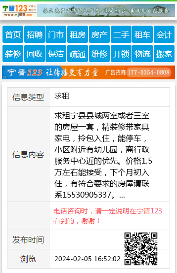 求租宁县县城两室或者三室的房屋一套,精装修带家具家电,拎包入住,能停车,小区附近有幼儿园,离行政服务中心近的优先。价格1.5万左右能接受,下个月初入住,有符合要求的房屋请联系15530905337。 【电话咨询时,请一定说明在宁晋123看到的,谢谢!】 |